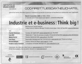 Une grande première pour l'industrie Romande. First Tuesday, célèbre pour ses événements centrés sur internet ainsi que la très dynamique Promotion Economique Neuchâteloise et CapeGrowth, le spécialiste de la nouvelle économie industrielle, ont co-organisé le premier First Tuesday spécial Industrie.