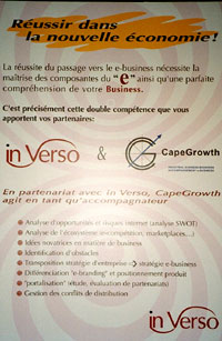 CapeGrowth était présent au forum des technologies de l'information et de la nouvelle économie INFORUM 2000. Ce forum organisé par l 'Office pour la Promotion de l'Industrie Genevoise a regroupé une quarantaine d'exposants. Grande affluence à la conférence donnée par CapeGrowth et inVerso sur le thème ¨réussir dans la nouvelle économie industrielle¨.